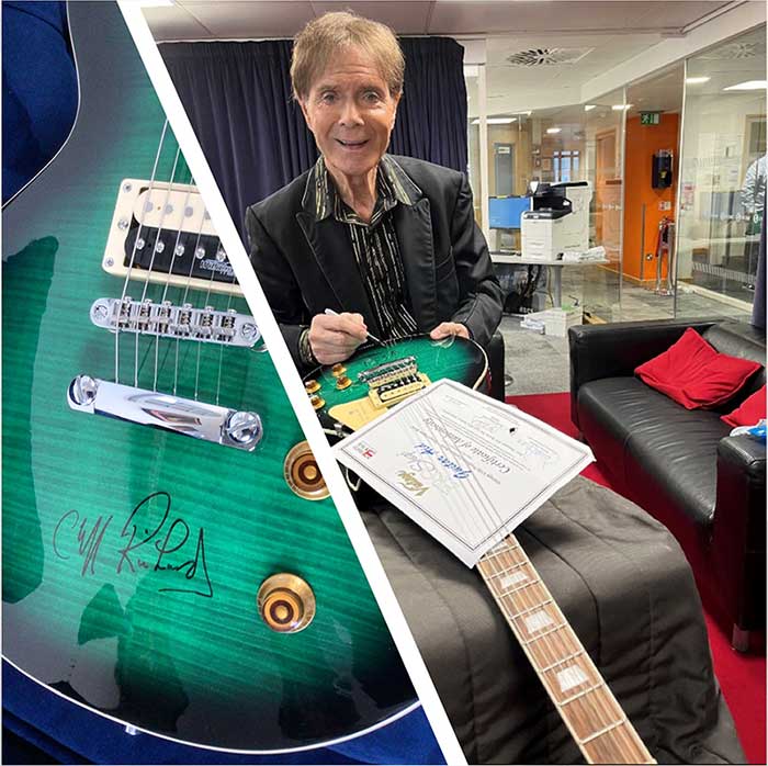 The idea was that we would get Sir Cliff Richard, our patron, to sign all four guitars. True to their word, Dennis and Paul from J.H.S. managed to get this done to a standard of excellence. The publicity resulted in many Christian magazines; one featured a story, with the title, ‘Meet the man giving away 4.000 weapons of worship’.